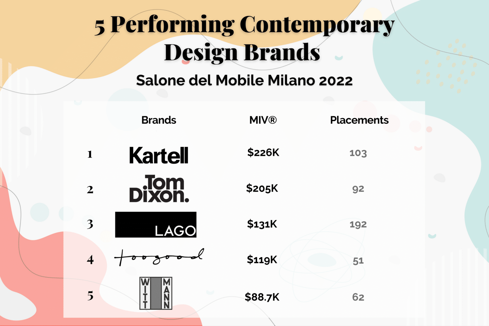 Kartell, a contemporary design brand with over 70 years of history, has proven its market potential at the Salone del Mobile Milano event by securing a total of $226K in MIV® across 103 placements.