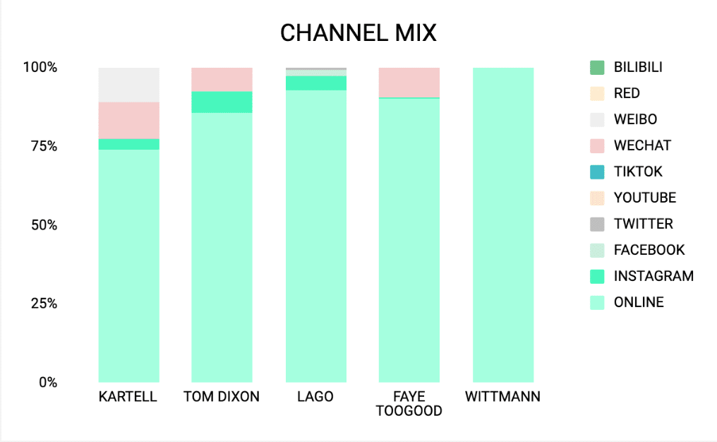 Are you looking to optimize your contemporary design brand’s marketing strategy and boost its exposure? Then you need to pay attention to the Channel Mix – a powerful metric that reveals which channels consumers are most exposed to. From online media and Instagram to Facebook and Chinese social media platforms like Weibo and WeChat, this metric provides a percentage breakdown of each channel’s contribution to your brand’s MIV®. By understanding your Channel Mix, you can gain a competitive edge by identifying which channels your competitors are leveraging and which channels you should be focusing on to increase your brand’s exposure.