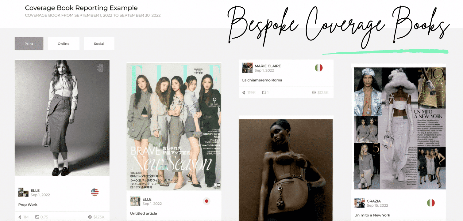 Nos Coverage Books catégorisent les mentions les plus significatives de la marque de nos clients tout au long de l’année. Ils peuvent être affichés par canal, par campagne, bref, en fonction de ce qui est le plus approprié pour votre marque.