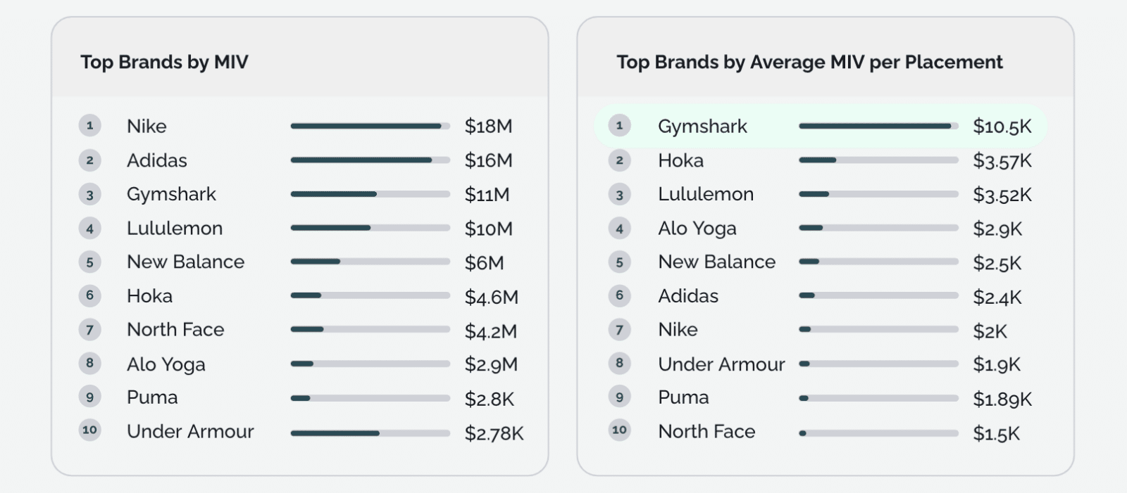 A standout example of brand efficiency comes from Gymshark, whose BFCM campaign last year set new standards in generating high Media Impact Value® (MIV®) per placement. While Nike led in overall MIV with $18 million, Gymshark topped the Average MIV per placement, reaching an impressive $10.5K compared to Nike’s $2K. This remarkable efficiency wasn’t just due to brand ambassadors; it was Gymshark’s strategic use of the Influencer Voice—particularly in selecting and leveraging the right tiers of influencers—that amplified its Black Friday sale effectively. By tapping into influencers who deeply resonated with their target audience, Gymshark maximized each placement’s value, nearly doubling its MIV across BFCM and holiday campaigns.