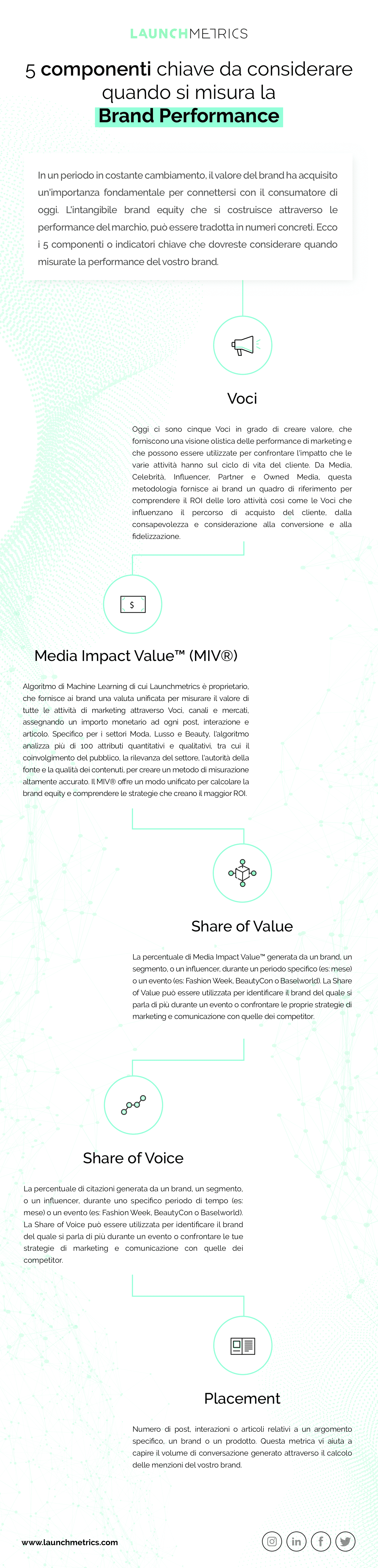 In Launchmetrics lavoriamo da anni al nostro algoritmo brevettato, Media Impact Value™, che attraverso l’analisi quantitativa e qualitativa è in grado di offrire un indicatore monetario unico di ogni azione del brand sia attraverso i social network, sia online che attraverso la stampa. Tuttavia, le performance del brand non si limitano a una singola metrica, ma devono essere comprese all’interno di un quadro di analisi e misurazione molto più ampio e attraverso una metodologia adattata alle specificità dell’industria della moda, del lusso e della bellezza.