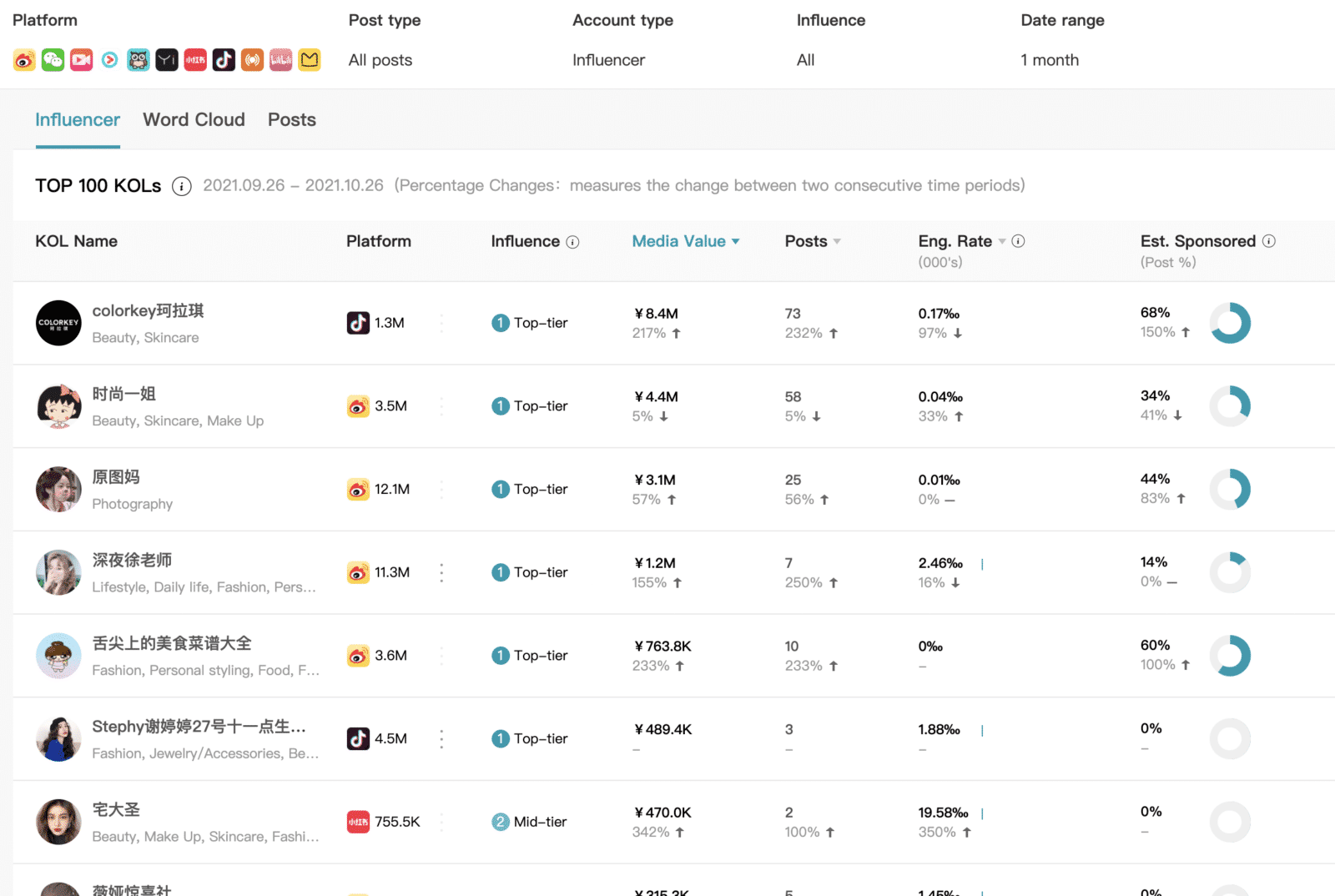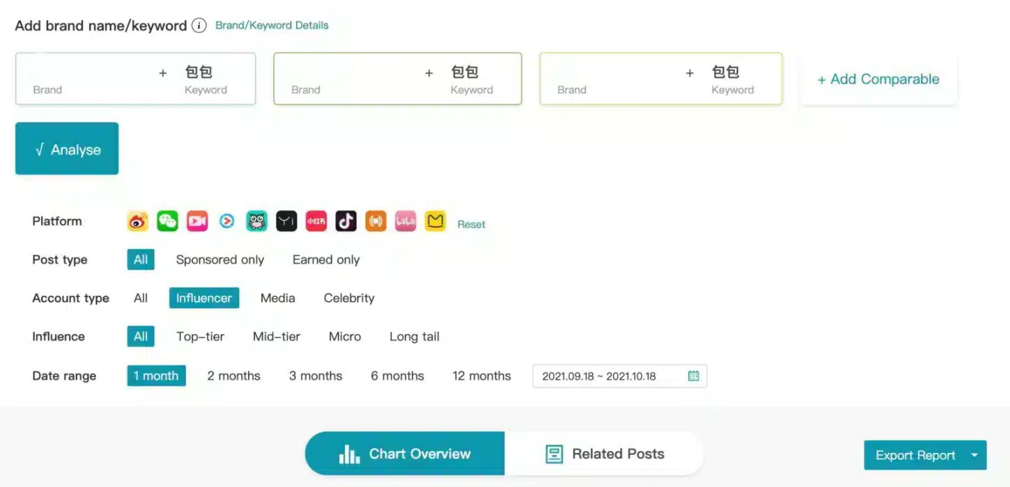 Se non siete sicuri di quali siano le migliori piattaforme cinesi per la vostra campagna, date prima un’occhiata a quello che stanno facendo i vostri concorrenti. Attraverso l’uso del software di Influencer Marketing progettato per la Cina, i brand possono accedere a librerie di brand e a strumenti di ricerca di parole chiave di precisione che daranno chiarezza sull’uso dell’influencer da parte dei concorrenti durante periodi di tempo specifici e su quali piattaforme social i vostri concorrenti sono più attivi.