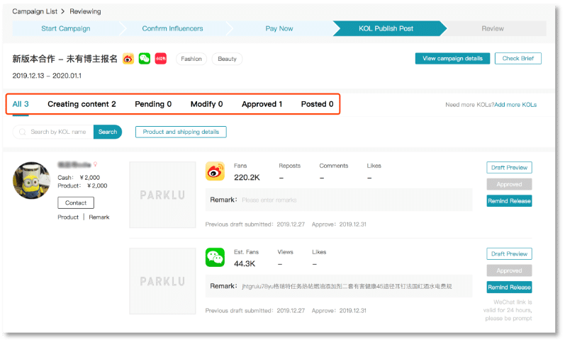 Il successivo passo a cui i brand devono pensare riguarda i contenuti che i Key Opinion Leaders dovranno postare. Se state selezionando i KOL da uno strumento digitale specificamente progettato per le campagne KOL, come il software di Influencer Marketing per la Cina di Launchmetrics, allora i KOL saranno divisi in diverse categorie che vi aiuteranno a monitorare la progressione del processo di creazione dei contenuti dei vostri KOL. Se sono nella fase “Creating Content”, significa che quei KOL sono in fase di scrittura e non hanno inviato bozze da rivedere. I KOL nell’elenco “Pending” hanno presentato delle bozze e sono in attesa di revisione. Nella sezione “Modify”, i KOL stanno rivedendo le loro bozze in base al feedback del brand e appariranno di nuovo nella lista “Pending” dopo aver presentato un’altra bozza. La fase finale è “Approved”, che dà ai KOL il via libera per pubblicare ufficialmente sulle rispettive piattaforme.