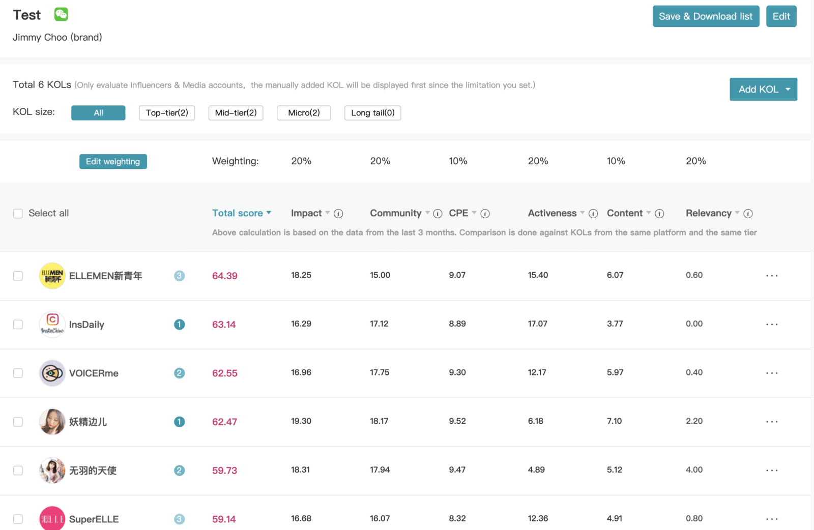 Scegliere il giusto KOL è fondamentale, e richiede un’enorme quantità di tempo da parte dei brand. Uno strumento di influencer marketing che può aiutare a valutare e indicare ai brand quali KOL sono più adatti per una campagna è una risorsa incommensurabile per la campagna e il processo di pianificazione di un brand. L’utilizzo di strumenti digitali aiuta a suddividere le metriche chiave dei KOL tra cui l’impatto, la comunità, l’efficienza dei costi, la rilevanza, l’attività e la creatività dei contenuti. L’importanza di ogni metrica dovrebbe essere adattata per allinearsi con gli obiettivi del brand. Dopo ogni valutazione, un brand può salvare questa lista di influencer raccomandati insieme al loro punteggio complessivo per riferimenti futuri. E se i brand hanno già in mente qualcuno con cui lavorare, possono aggiungere manualmente i KOL in tale piattaforma e ricevere una lista che riporti sia i KOL aggiunti che quelli raccomandati in base alle sei metriche.