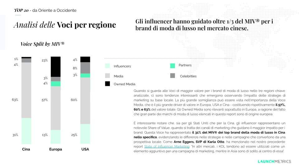 Partendo da una prospettiva regionale, abbiamo analizzato in base al MIV® quali tipi di Voci, Canali e Social post stanno prevalendo in Cina, Europa e Stati Uniti. Inoltre, spieghiamo perché i Mega e Mid-Tier Influencer rappresentino il maggior valore per i brand di moda di lusso.