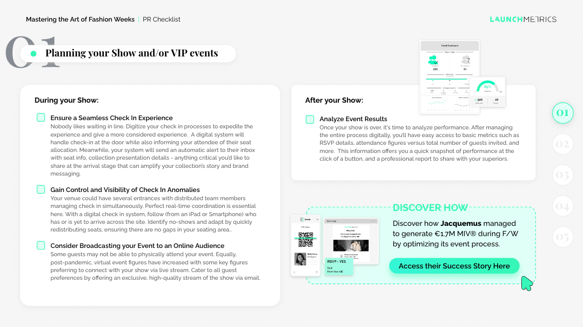 - Efficient Event Planning: Learn how to plan your show or VIP event effectively. Create a cohesive and memorable experience for attendees. Our checklist will guide you through every aspect of event planning, from guest list management to seating plan and check-in.