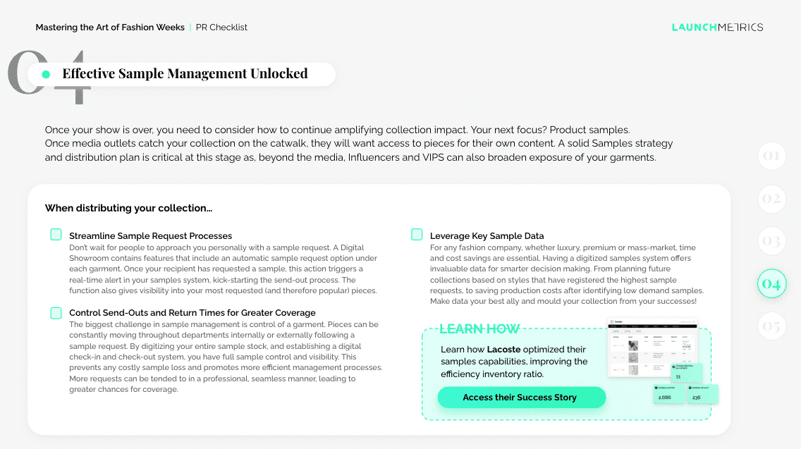 - Sample Management Optimization: Keeping track of product samples during Fashion Week can be a daunting task. Our checklist includes tips and tricks for optimized sample management. This will allow you to leverage samples for greater coverage and success next season.