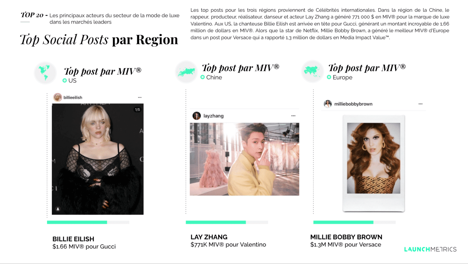 Afin d’atteindre un nouveau public, les marques doivent s’adapter, intégrer et utiliser les chaînes et le marketing natifs des marques et des consommateurs chinois. Nous décomposons les types de Voix, de Chaînes et de publications sur les réseaux sociaux en MIV® qui dominent en Chine, en Europe et aux États-Unis. Nous expliquons également pourquoi les influenceurs All-Star représentent le plus de valeur pour les marques de mode de luxe par région.
