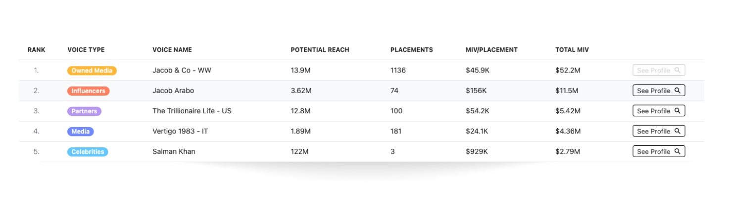 Let’s take a look at a real-world example of how some of these essential KPIs can be used when analyzing the performance of competitors. Say a luxury watch brand wants to understand which Voices are driving the strongest impact for competitors like Jacob & Co. Using Launchmetrics Insights, they can see that, at first glance, the brand’s Owned Media appears to dominate, generating more than 1,100 placements in just six months, each worth an average of $45.9K MIV per placement.