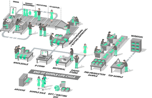 A lo largo de las cuatro fases de lanzamiento del producto, hay varios conjuntos de muestras que se mueven desde el diseño y la comercialización hasta las ventas, el comercio electrónico y las relaciones públicas / marketing. Con el movimiento constante, las muestras podrían perderse, quedar atrapadas en la aduana y perder oportunidades de ventas, editoriales y fotografías debido a demoras en el lanzamiento al mercado.