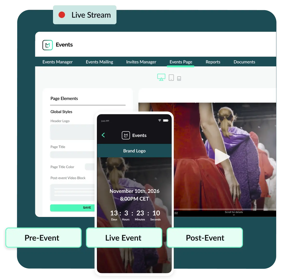 Reach wider audiences with new event formats. Create pre-recorded or live stream digital events in an open or invite-only environment, integrating your video stream from YouTube or Vimeo - Fully Branded Event Experiences