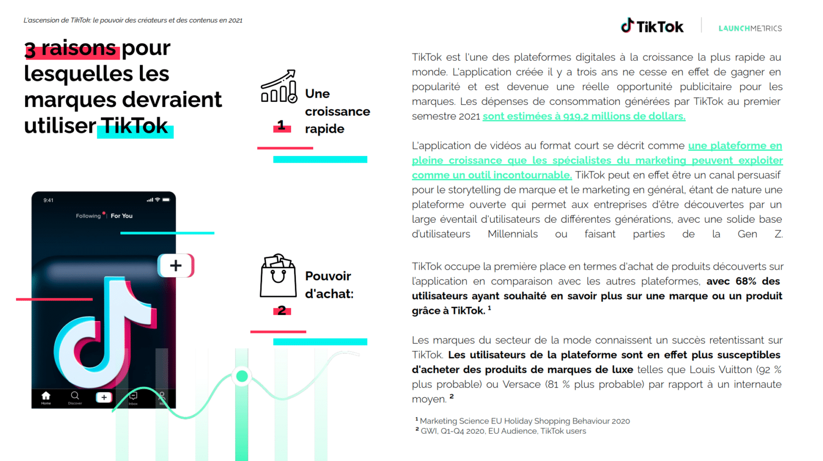 TikTok repose sur des millions de créateurs de contenu produit dans des formats qui, à bien des égards, ne sont pas bien compris par les spécialistes du marketing et les responsables des réseaux sociaux. Pour cette raison, ce rapport met en évidence quels sont les tactiques pour booster l’engagement sur la plateforme et augmenter son MIV®, en plus de traiter en profondeur de l’avenir de la plateforme pour adapter votre stratégie marketing. Vous aurez également accès à 10 études de cas Mode & Luxe de Créateurs & Marques qui vous aidera à vous inspirer pour votre strategie de marketing d’influence. De plus, ce rapport offre une vision exclusive du réseau social selon les professionnels du secteur et quels sont selon eux les données & insights pour tirer le meilleur parti de TikTok.