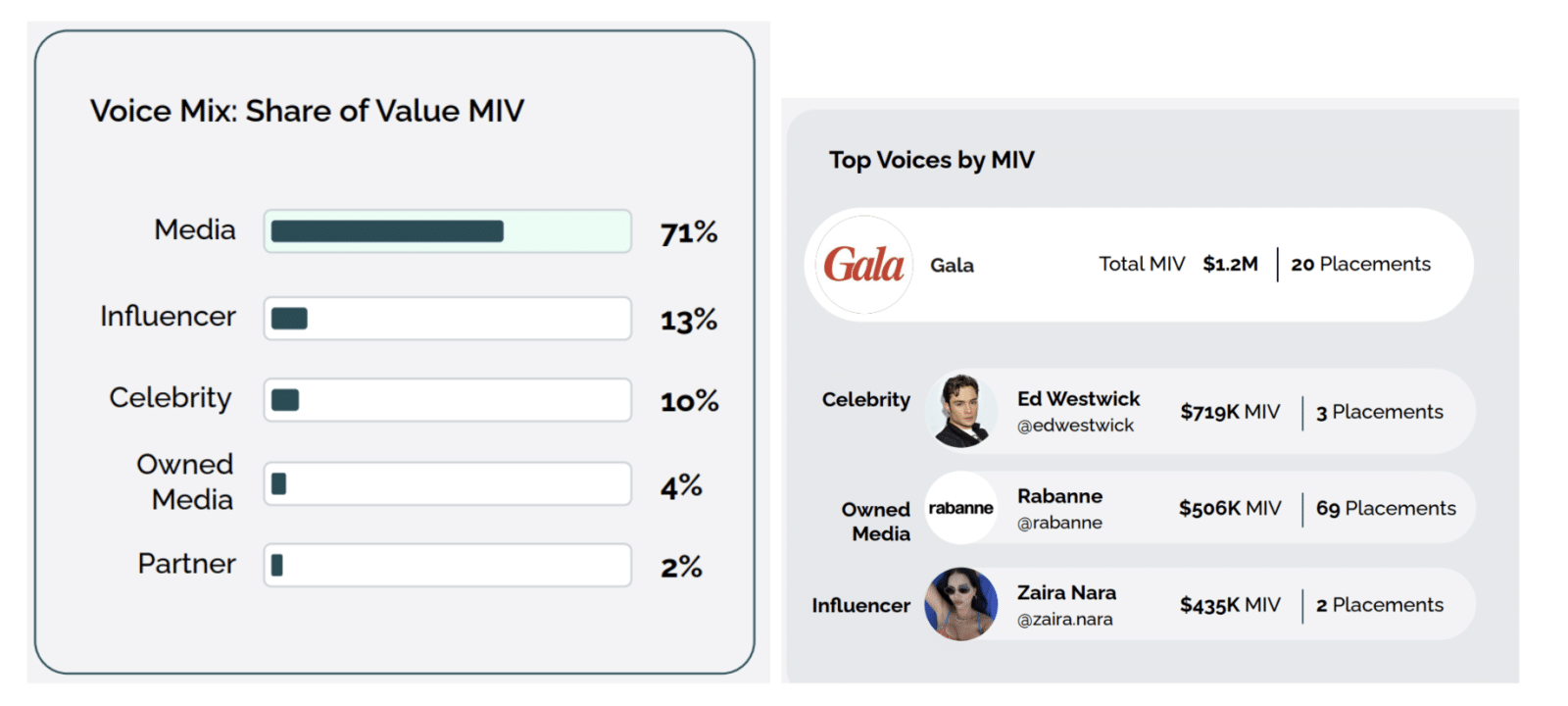 Using a Voice-centric approach gives you a way to organize and interpret your brand performance data to make it more meaningful and actionable. For instance, instead of just tracking engagement and reach levels on a platform like Instagram or TikTok, a Voice-centric approach allows you to understand which Voices deliver the best results and identify the ideal Voice mix for your brand’s success. When used in conjunction with a standardized metric—such as Media Impact Value® (MIV®), which we’ll look at below—you can compare how Voices perform across different platforms, in different regions and even between online and offline initiatives.