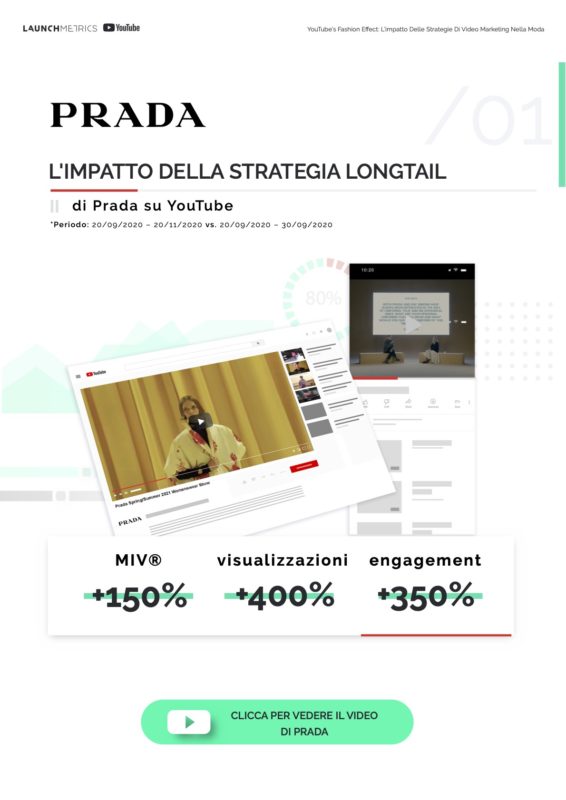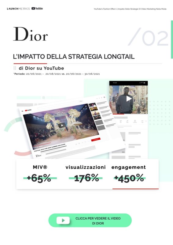 In questo report, esploriamo 6 casi di successso di alcuni grandi brand della moda – Prada, Dior, Pyer Moss, JW Anderson, Versace e Gucci – che hanno sfruttato YouTube nella loro strategia di video marketing, durante le precedenti stagioni della Fashion Week, e in che modo hanno sperimentato grandi risultati in termini di performance, espandendo la loro reach e raggiungendo un nuovo pubblico. Analizziamo le strategie di successo dietro questi risultati ed esaminiamo lo stato del settore oggi.